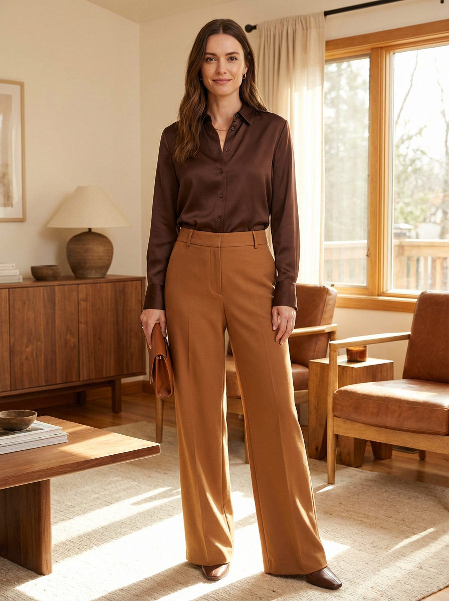 model wearing chocolate brown silk blouse and caramel trousers , luxurious textures, rich earth tones, sophisticated styling, warm natural lighting