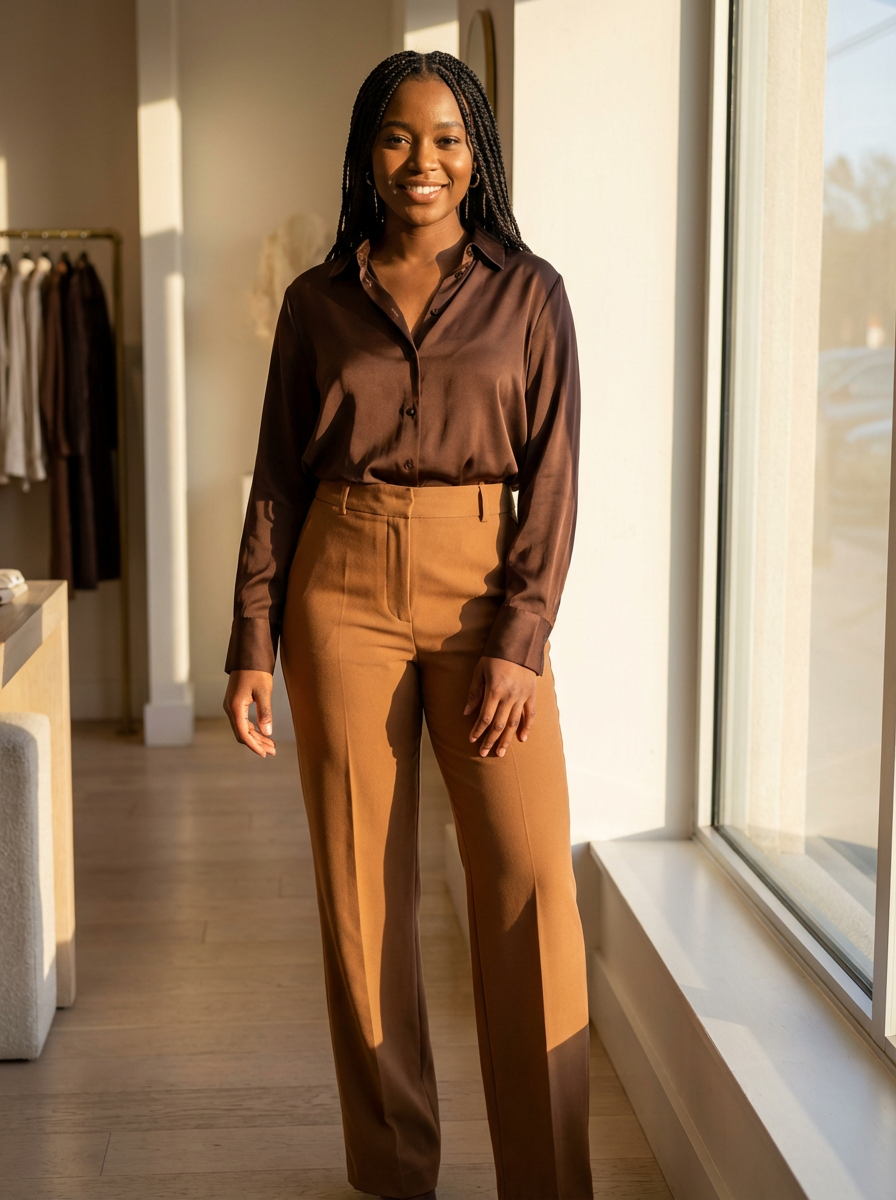 model wearing chocolate brown silk blouse and caramel trousers , luxurious textures, rich earth tones, sophisticated styling, warm natural lighting