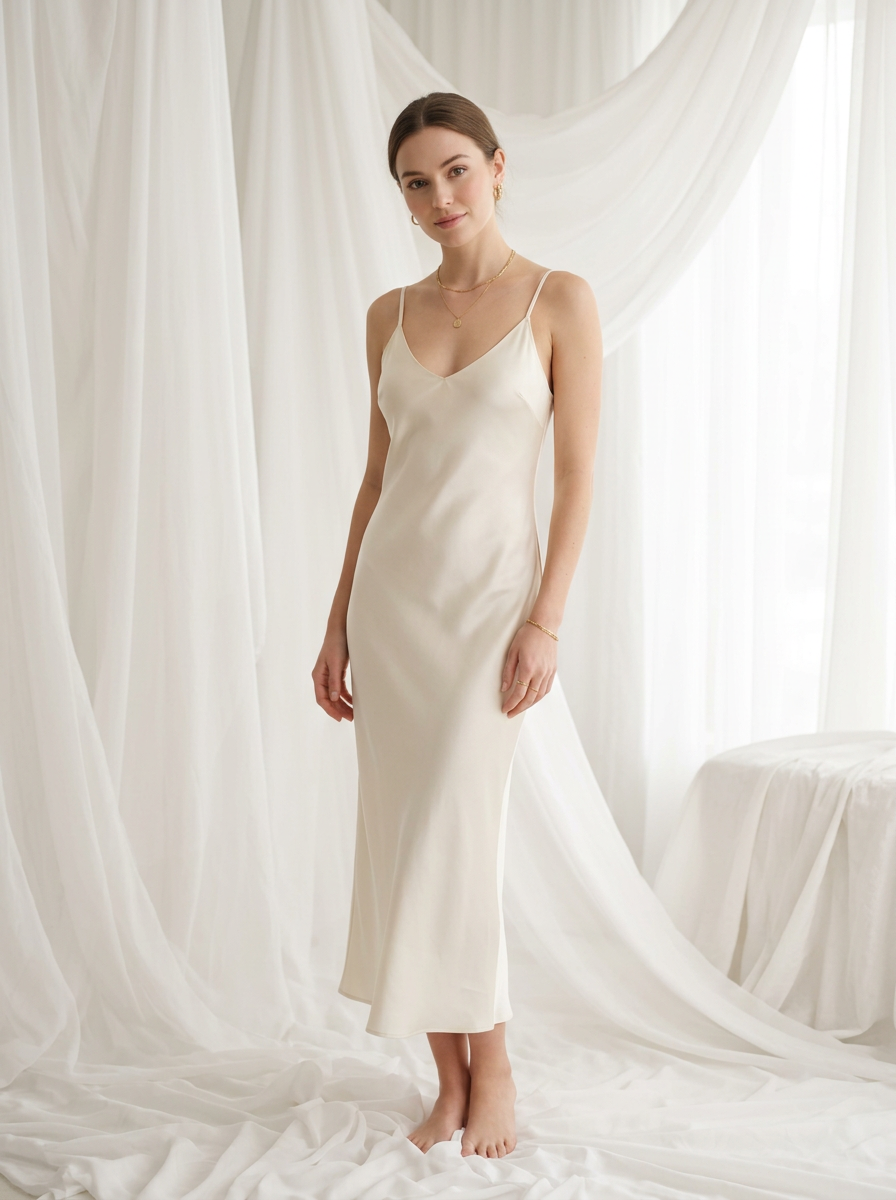 model wearing cream satin slip dress with delicate gold jewelry , luxurious layered whites, premium fabrics, ethereal soft-focus lighting