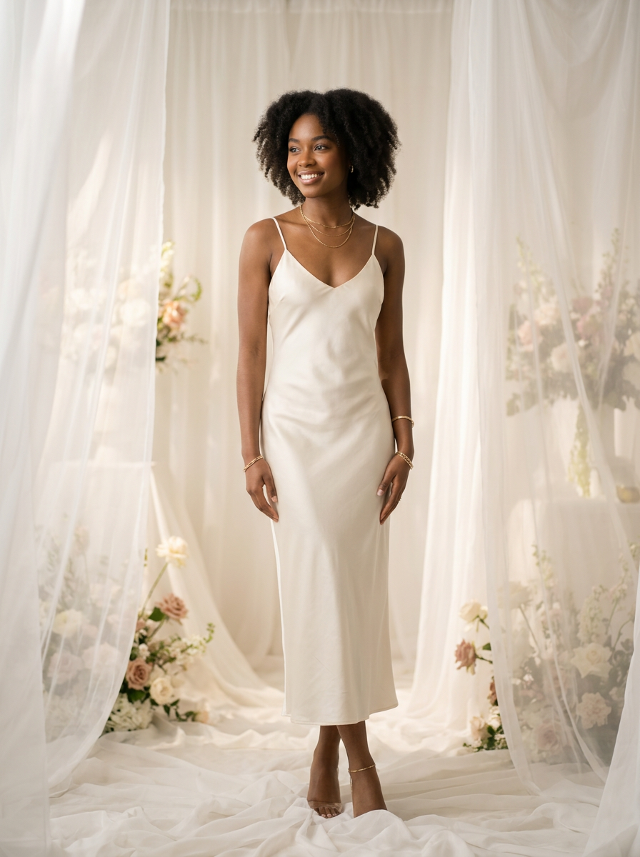 model wearing cream satin slip dress with delicate gold jewelry , luxurious layered whites, premium fabrics, ethereal soft-focus lighting