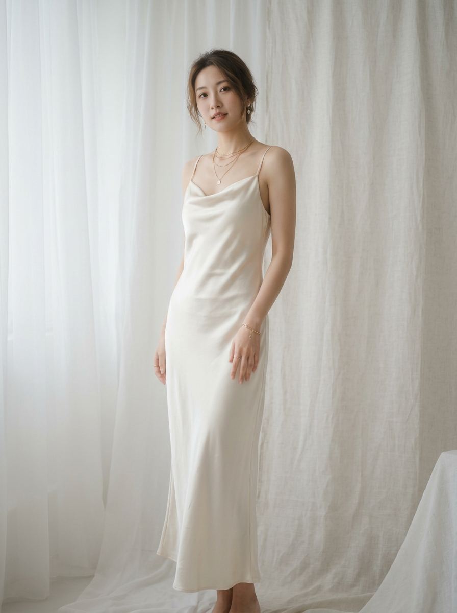 model wearing cream satin slip dress with delicate gold jewelry , luxurious layered whites, premium fabrics, ethereal soft-focus lighting