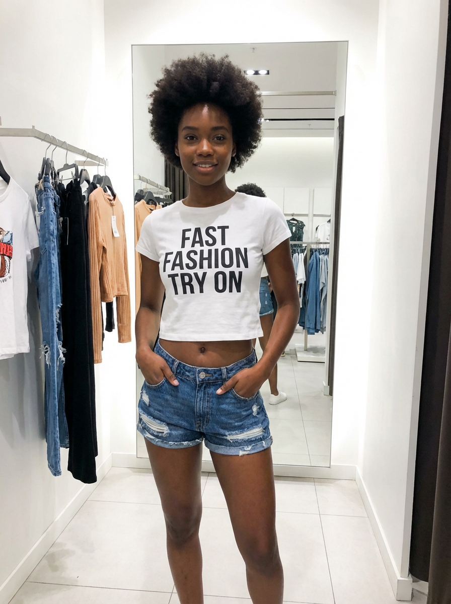 model wearing crop top and denim shorts in try on fashion shoot for fast fashion brand