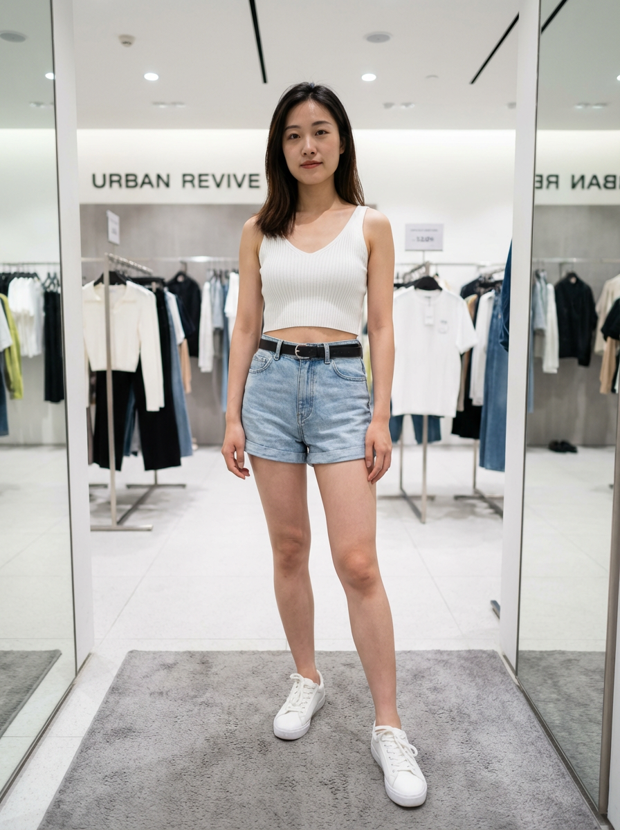 model wearing crop top and denim shorts in try on fashion shoot for fast fashion brand