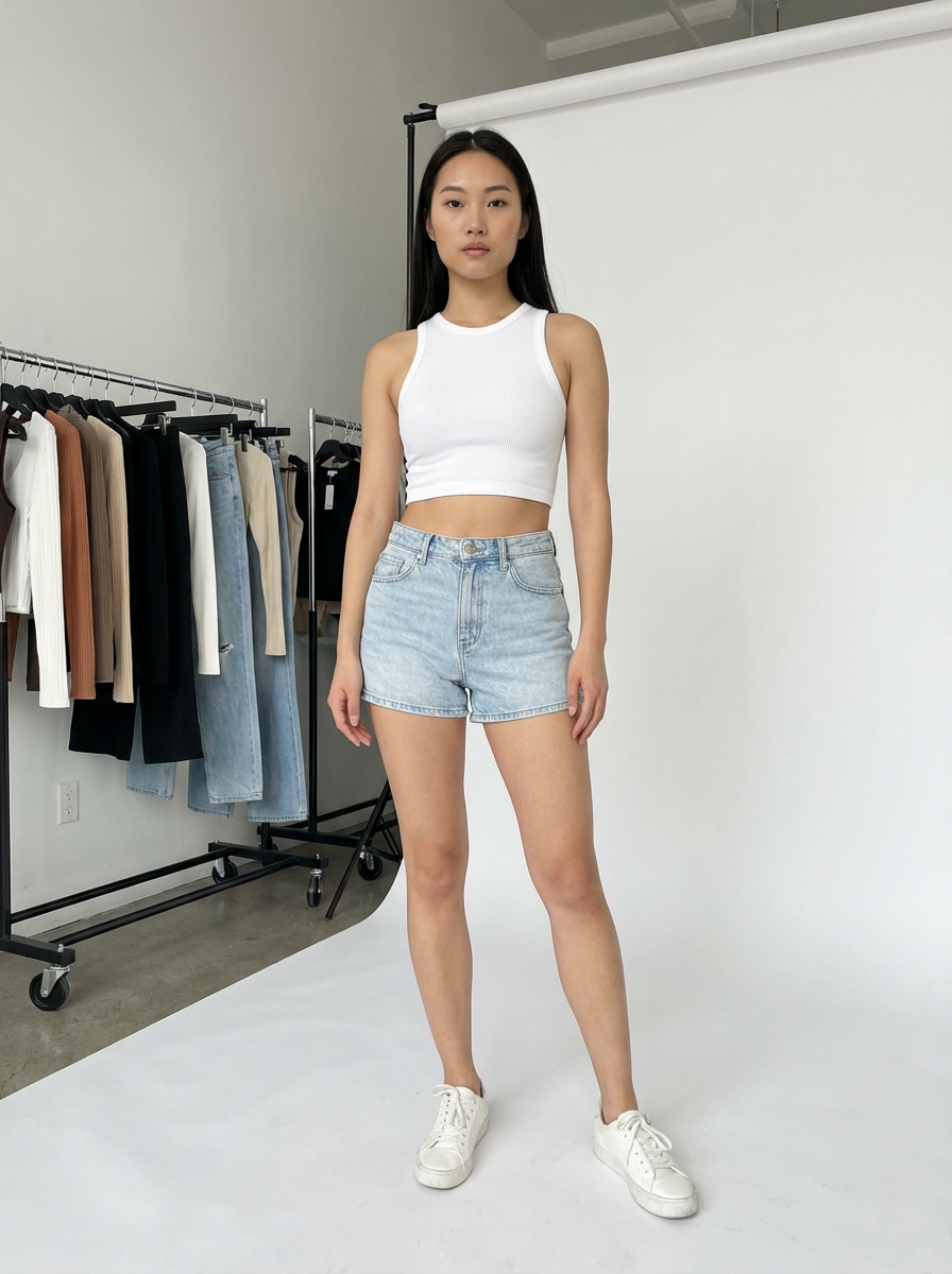 model wearing crop top and denim shorts in try on fashion shoot for fast fashion brand