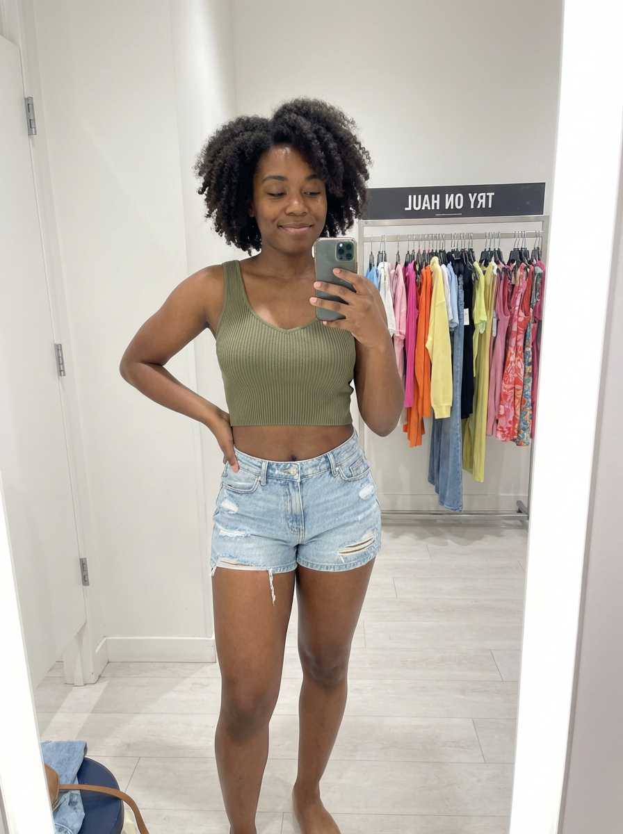 model wearing crop top and denim shorts in try on fashion shoot for fast fashion brand