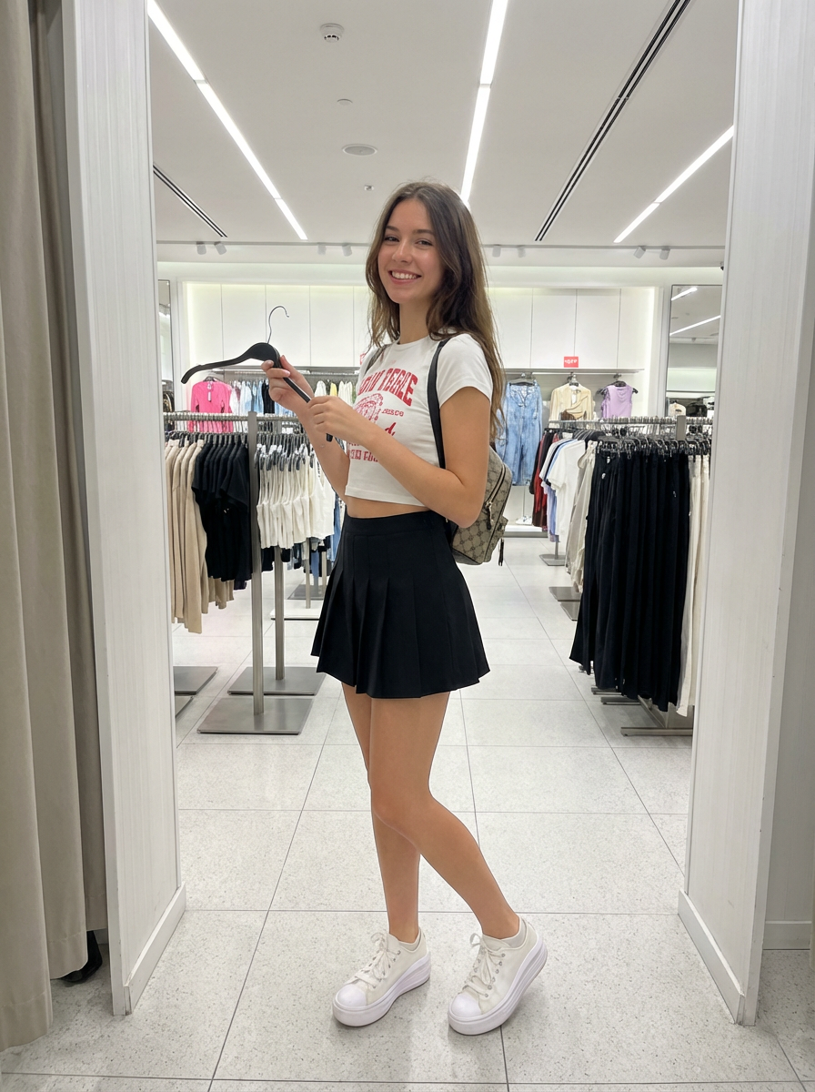 model wearing crop top and short pleated skirt in try on fashion shoot for Fast fashion brand