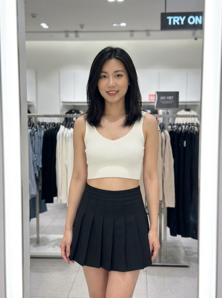 model wearing crop top and short pleated skirt in try on fashion shoot for Fast fashion brand