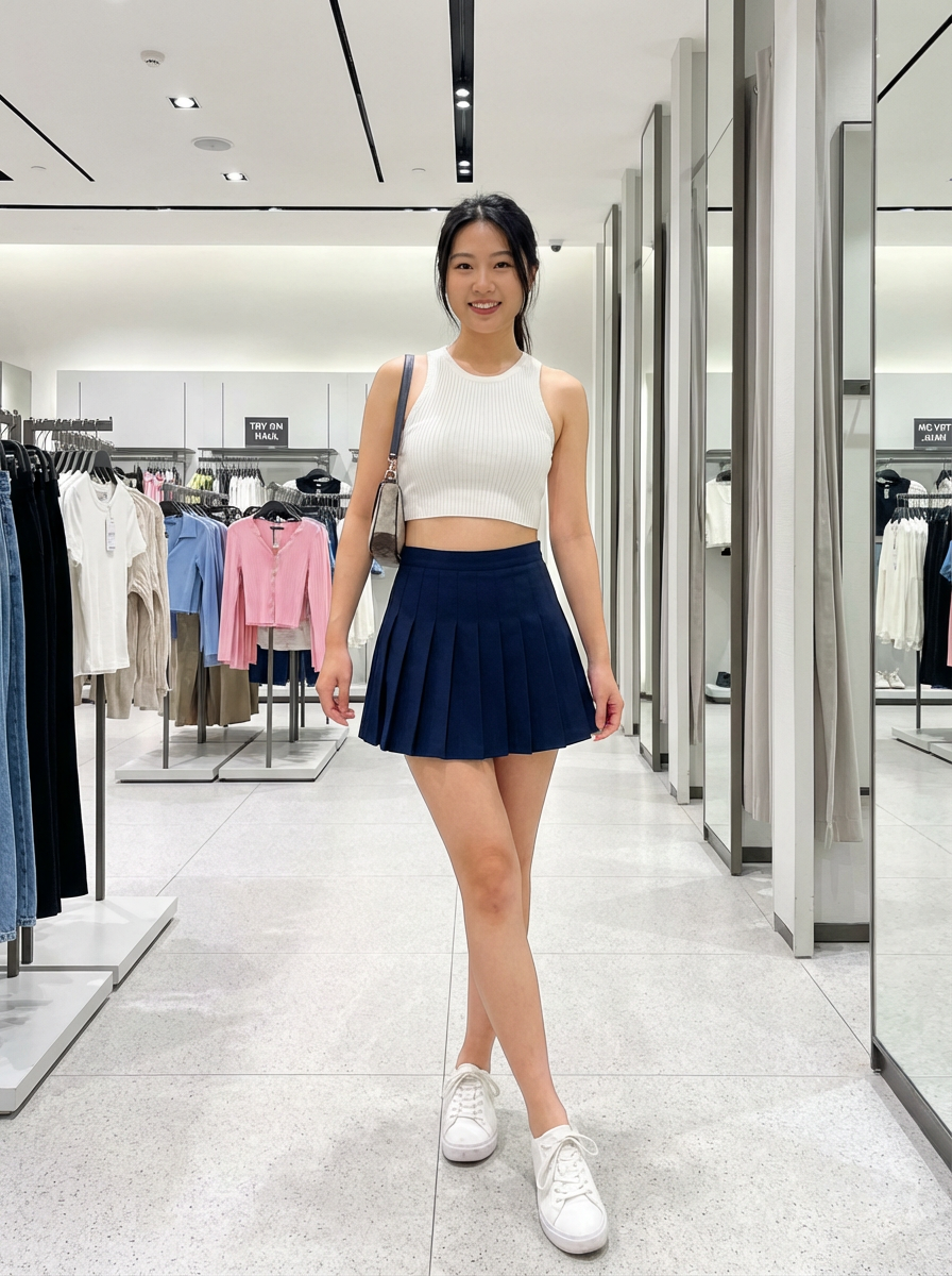 model wearing crop top and short pleated skirt in try on fashion shoot for Fast fashion brand