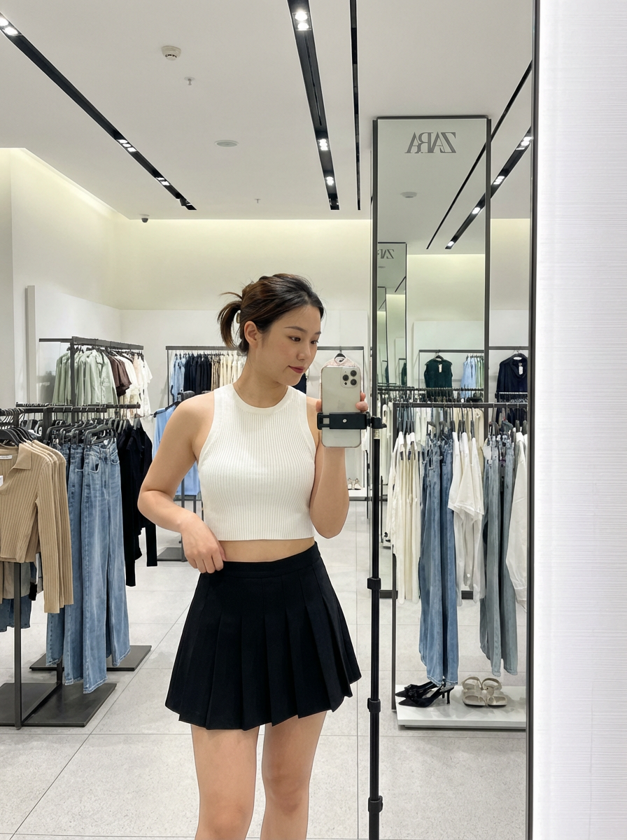 model wearing crop top and short pleated skirt in try on fashion shoot for Fast fashion brand
