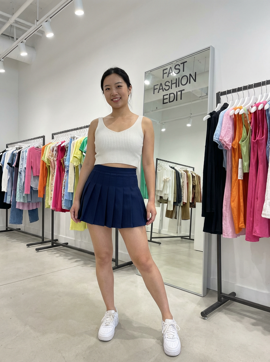 model wearing crop top and short pleated skirt in try on fashion shoot for Fast fashion brand