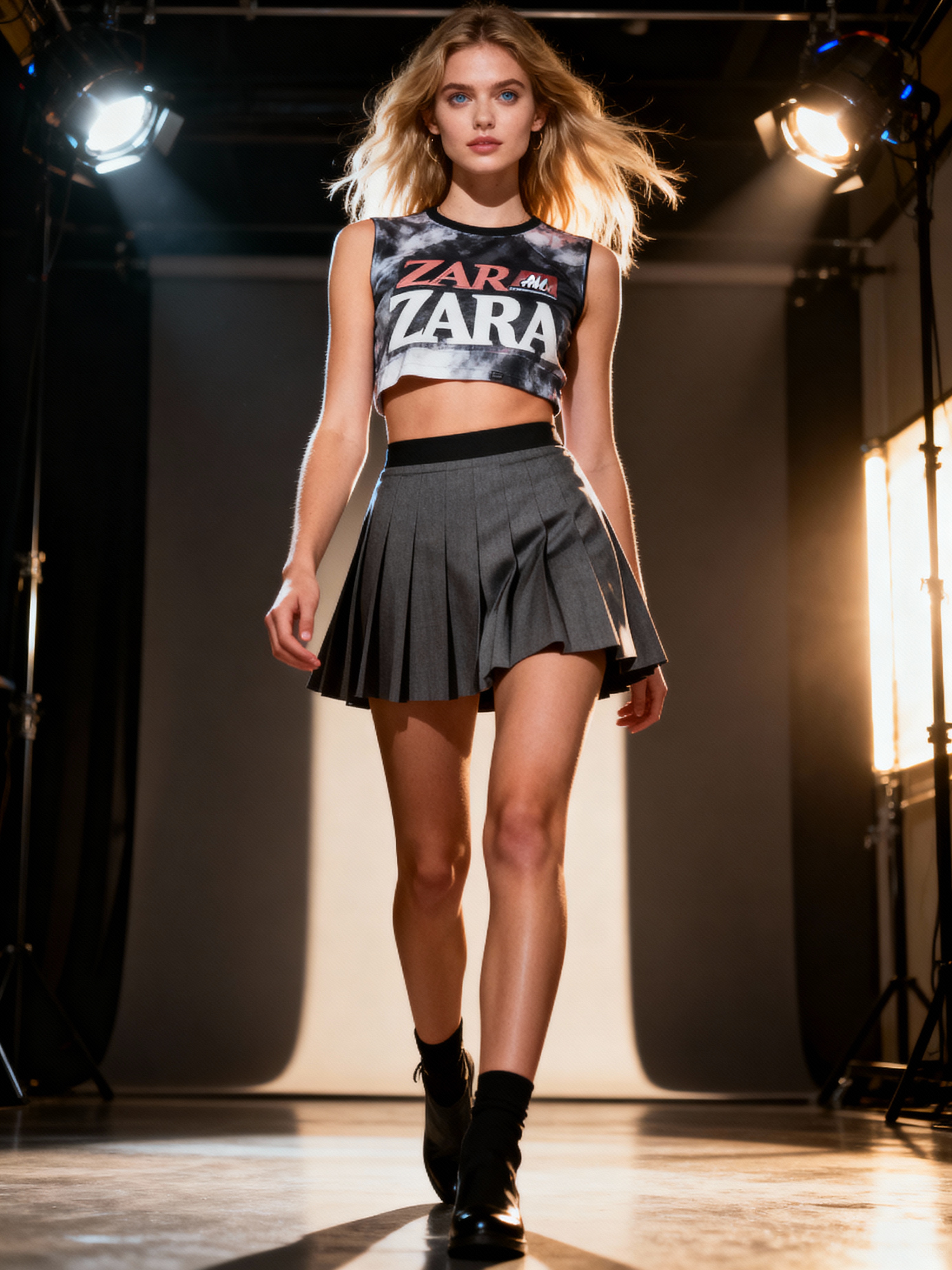 model wearing crop top and short pleated skirt in try on fashion shoot for Zara Shein H&M