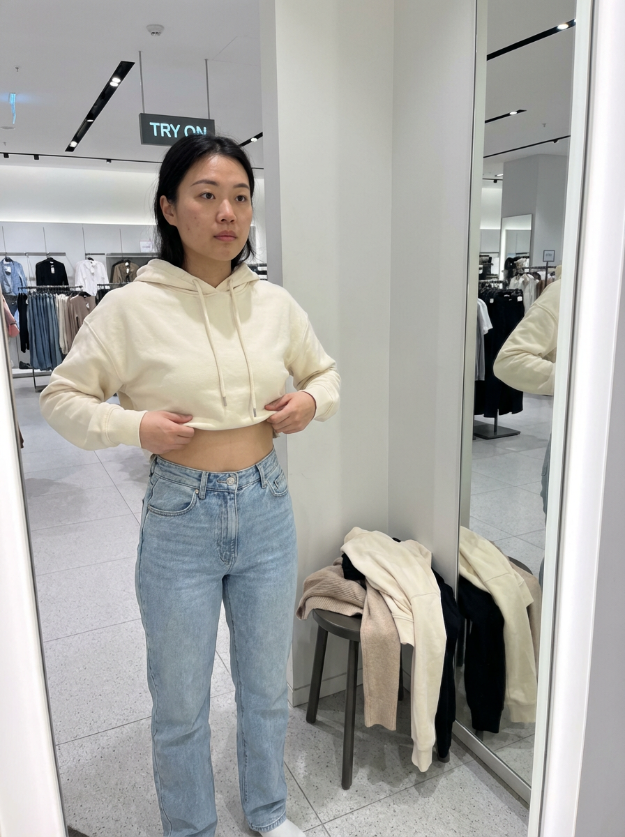 model wearing cropped cream hoodie in try on fashion shoot for Fast fashion brand