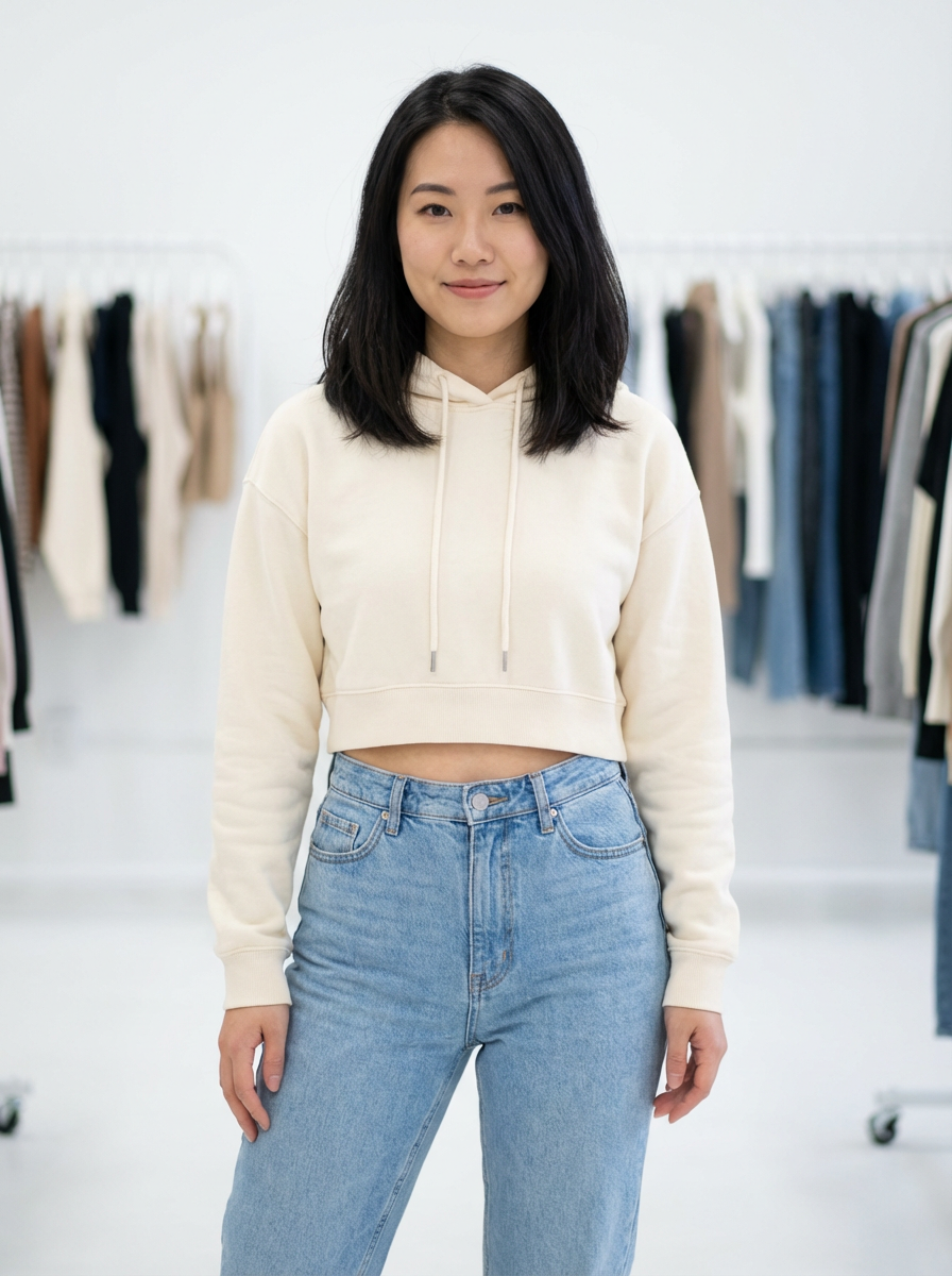 model wearing cropped cream hoodie in try on fashion shoot for Fast fashion brand