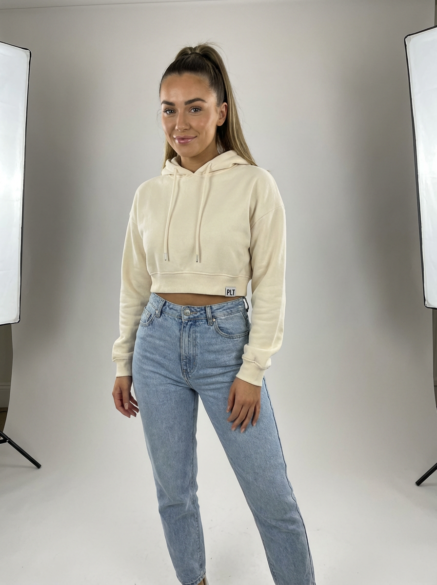 model wearing cropped cream hoodie in try on fashion shoot for Fast fashion brand