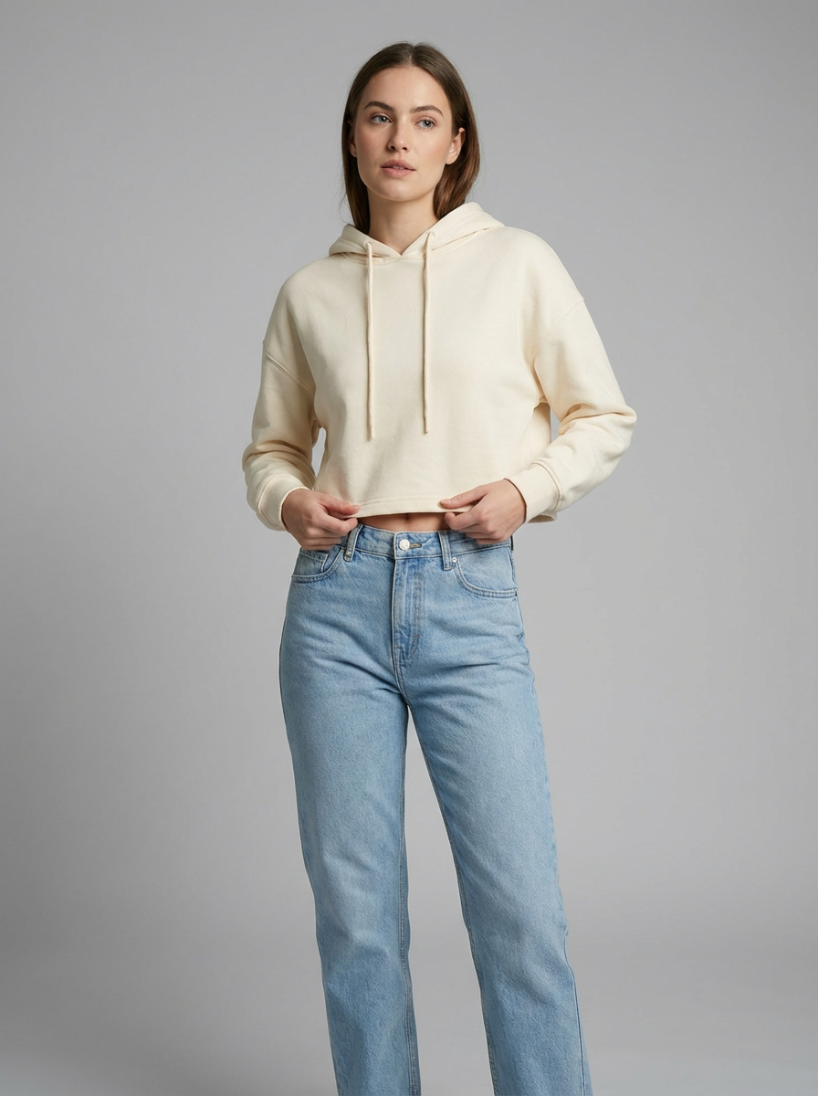 model wearing cropped cream hoodie in try on fashion shoot for Fast fashion brand