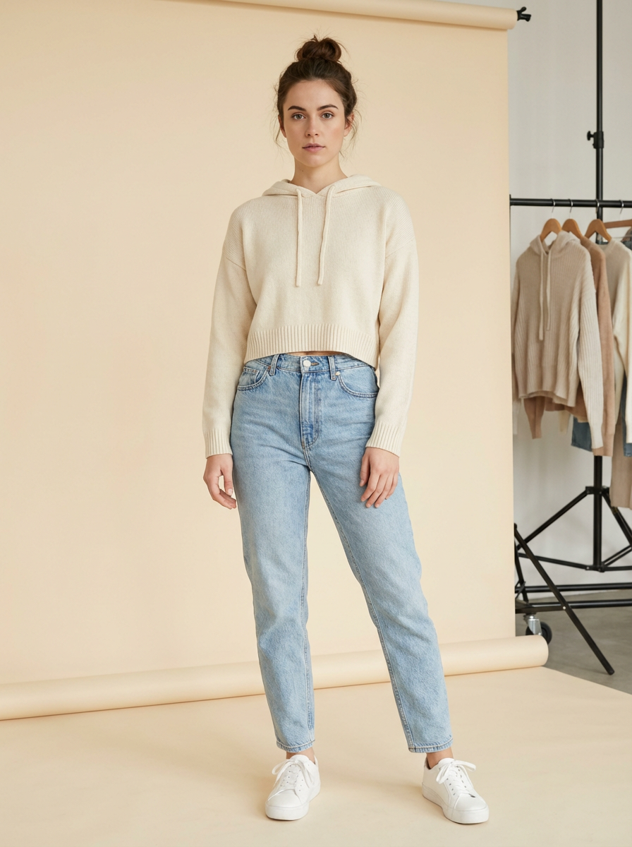 model wearing cropped cream hoodie in try on fashion shoot for Fast fashion brand