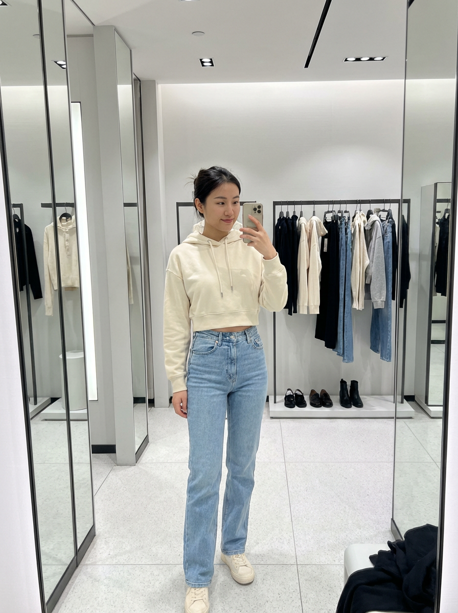 model wearing cropped cream hoodie in try on fashion shoot for Fast fashion brand