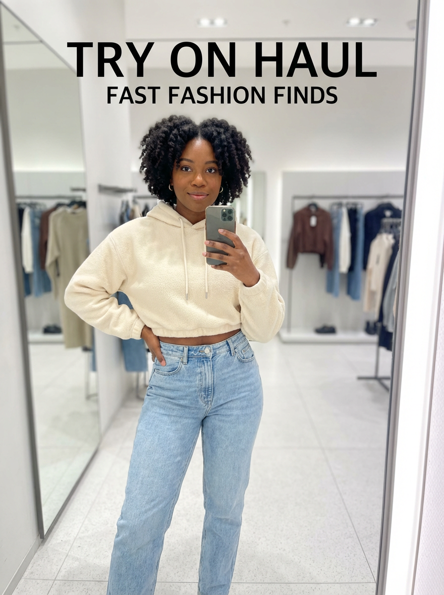 model wearing cropped cream hoodie in try on fashion shoot for Fast fashion brand