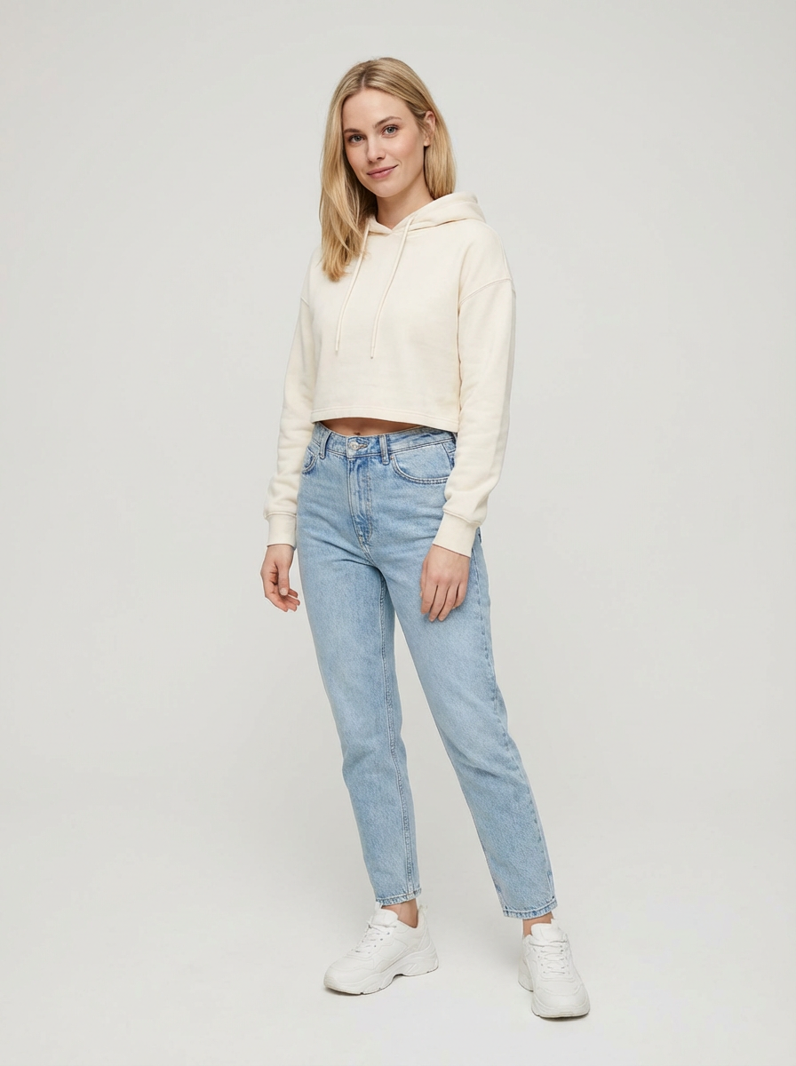 model wearing cropped cream hoodie in try on fashion shoot for Fast fashion brand