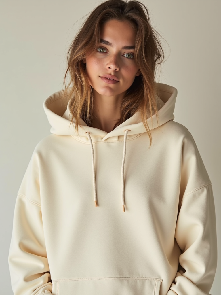 model wearing cropped cream hoodie in try on fashion shoot for Zara Shein H&M
