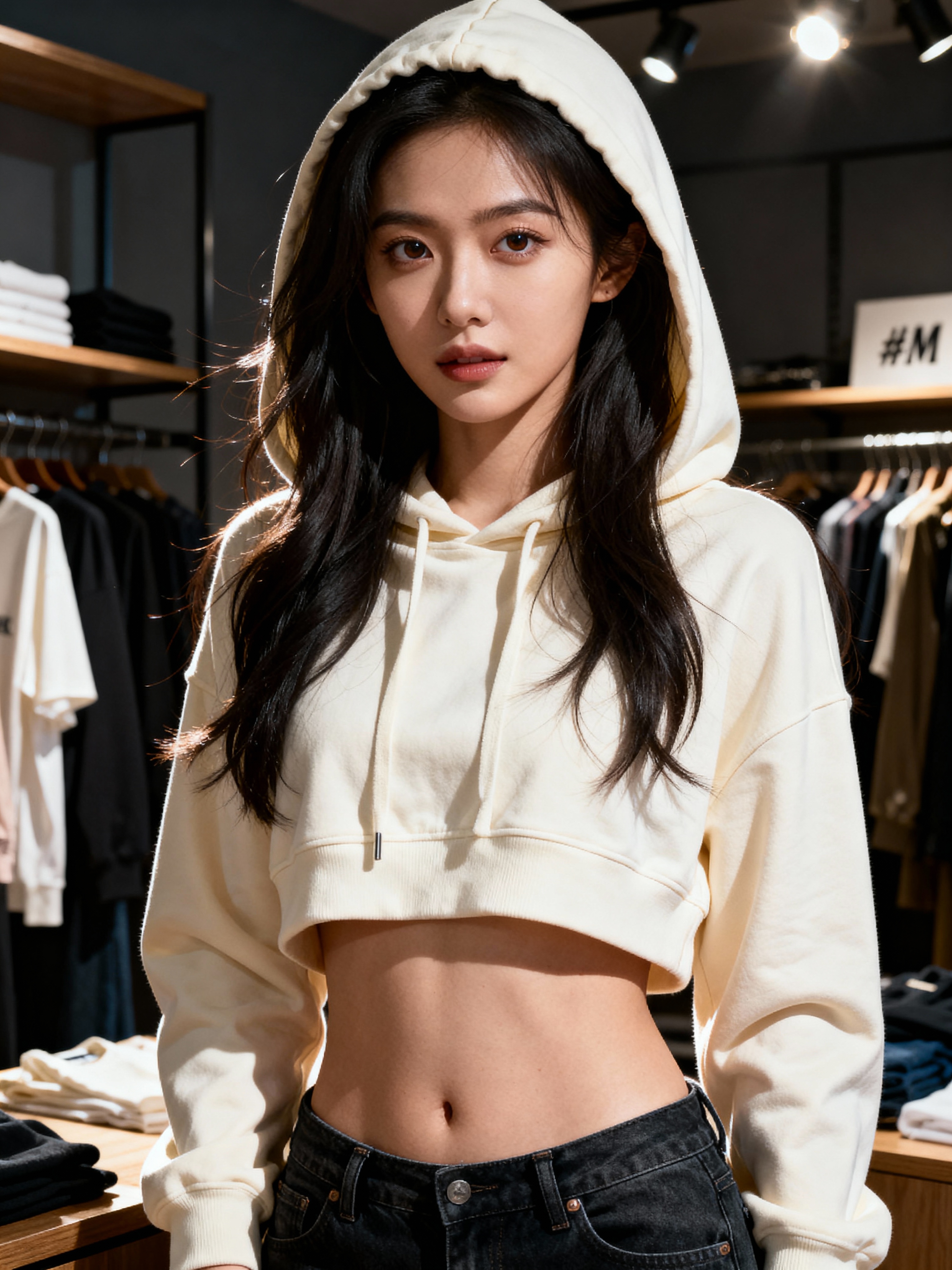 model wearing cropped cream hoodie in try on fashion shoot for Zara Shein H&M
