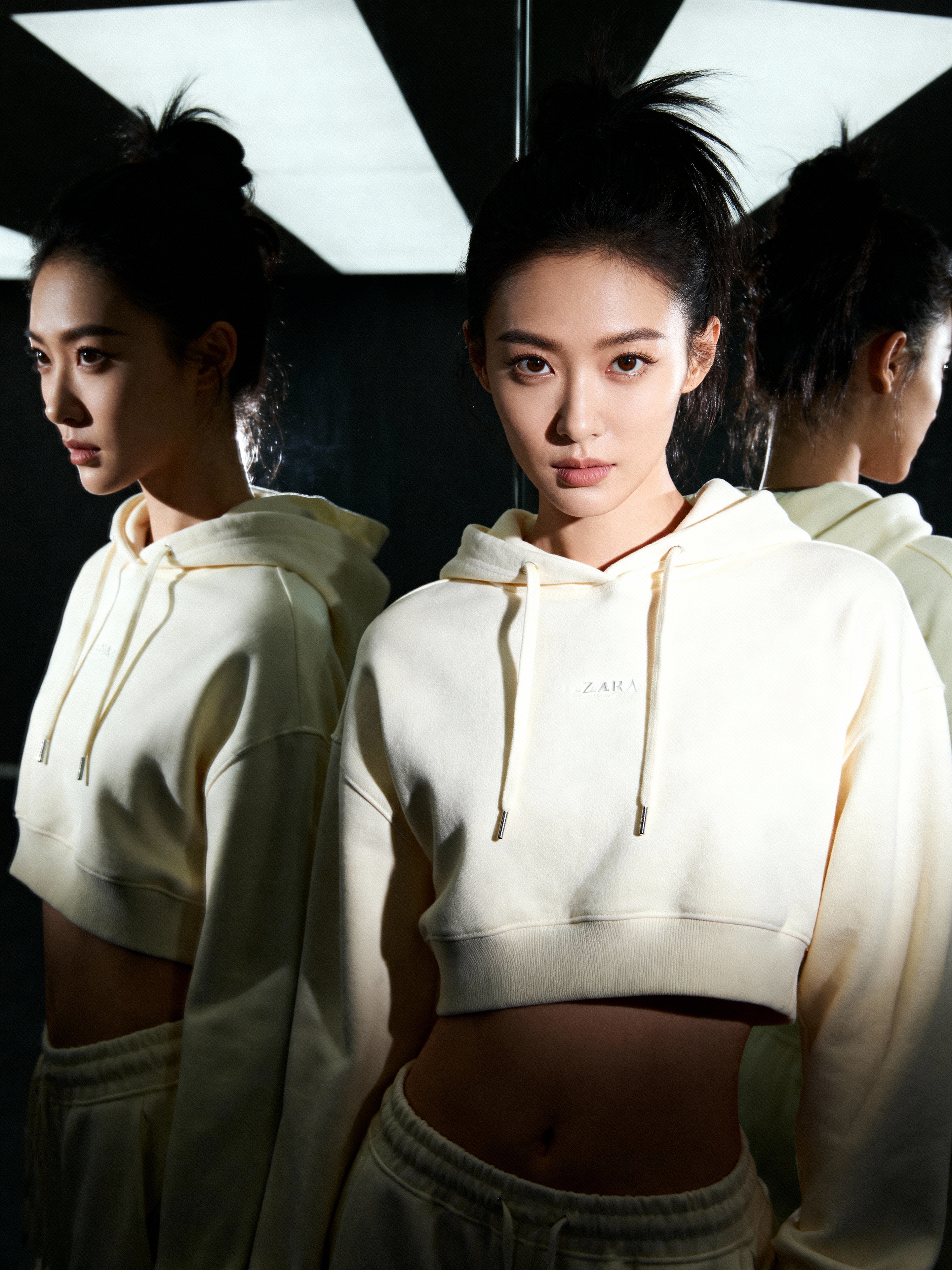 model wearing cropped cream hoodie in try on fashion shoot for Zara Shein H&M