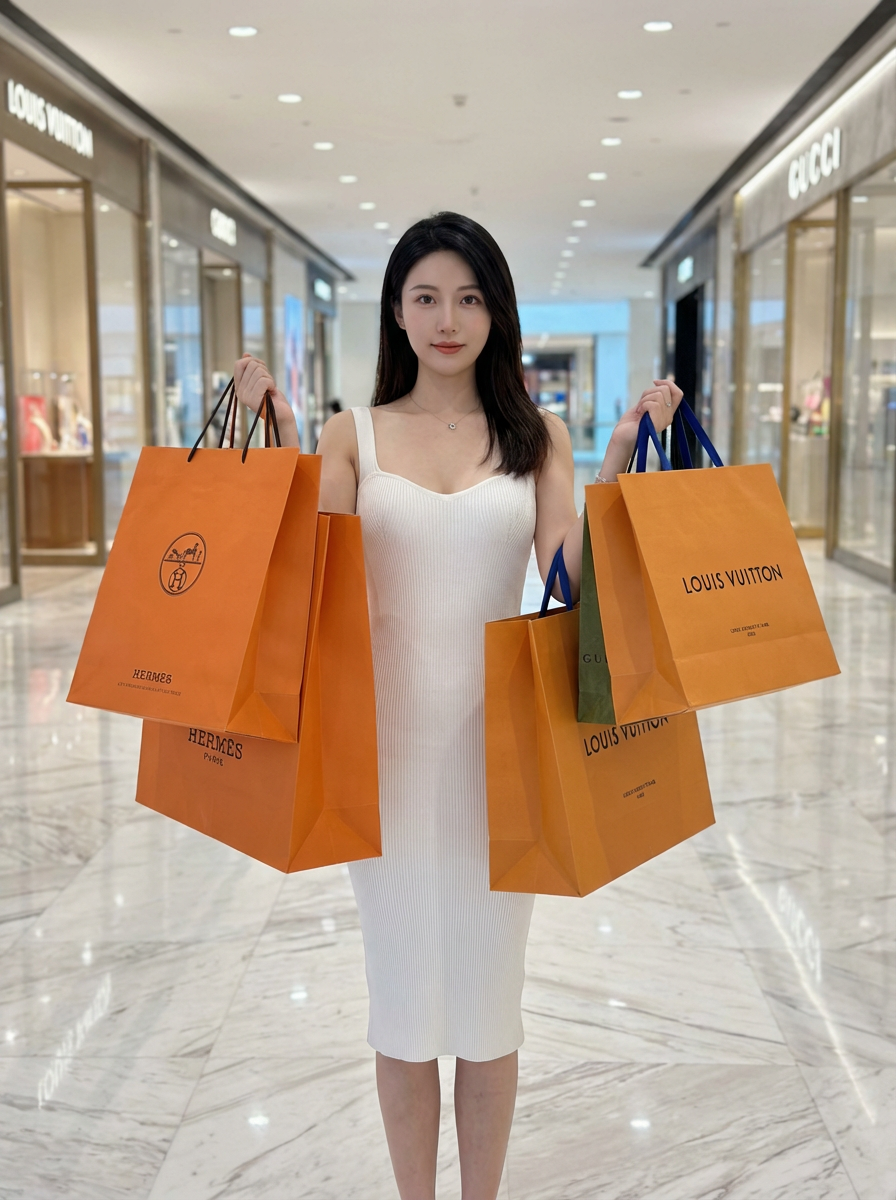 model wearing fitted white skin tight bodycon dress , holding many big orange luxury brand shopping bags in marble floor large luxury mall.