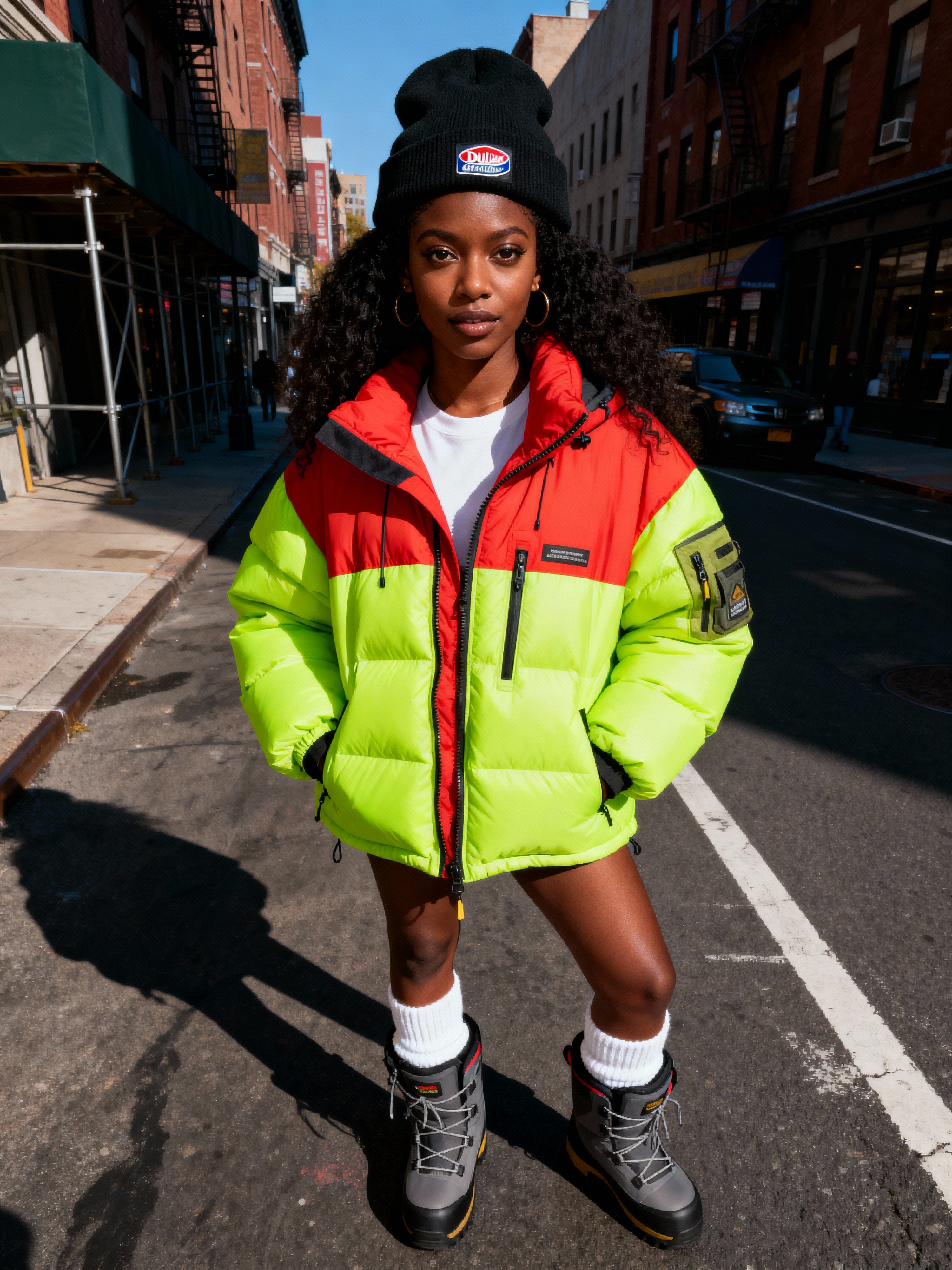 model wearing gorpcore aesthetic, functional outdoor clothing, bright colored puffer jacket, moonboots, beanie, white wool socks, outerwear, posing for photo in the street