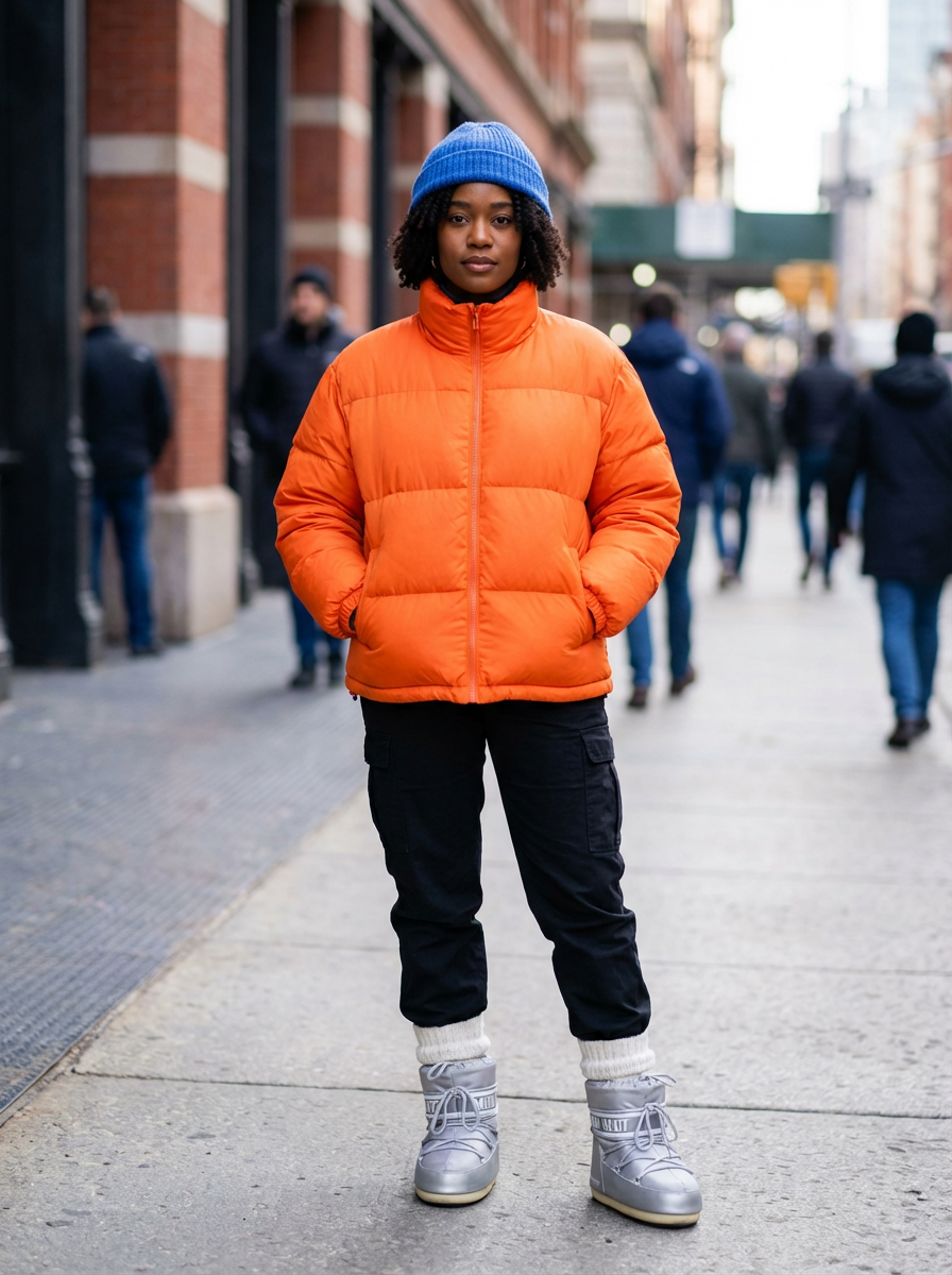 model wearing gorpcore aesthetic, functional outdoor clothing, bright colored puffer jacket, moonboots, beanie, white wool socks, outerwear, posing for photo in the street