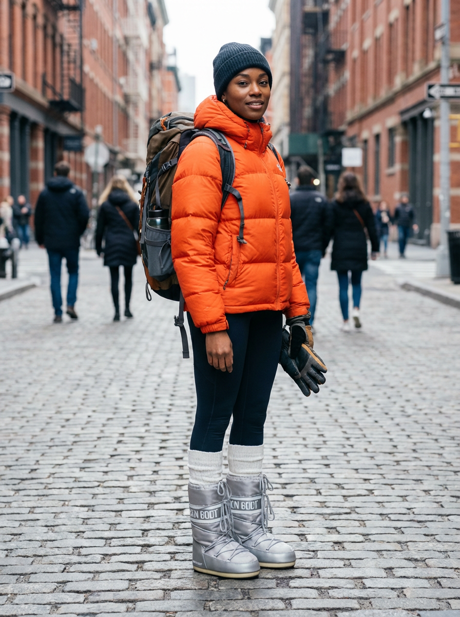 model wearing gorpcore aesthetic, functional outdoor clothing, bright colored puffer jacket, moonboots, beanie, white wool socks, outerwear, posing for photo in the street