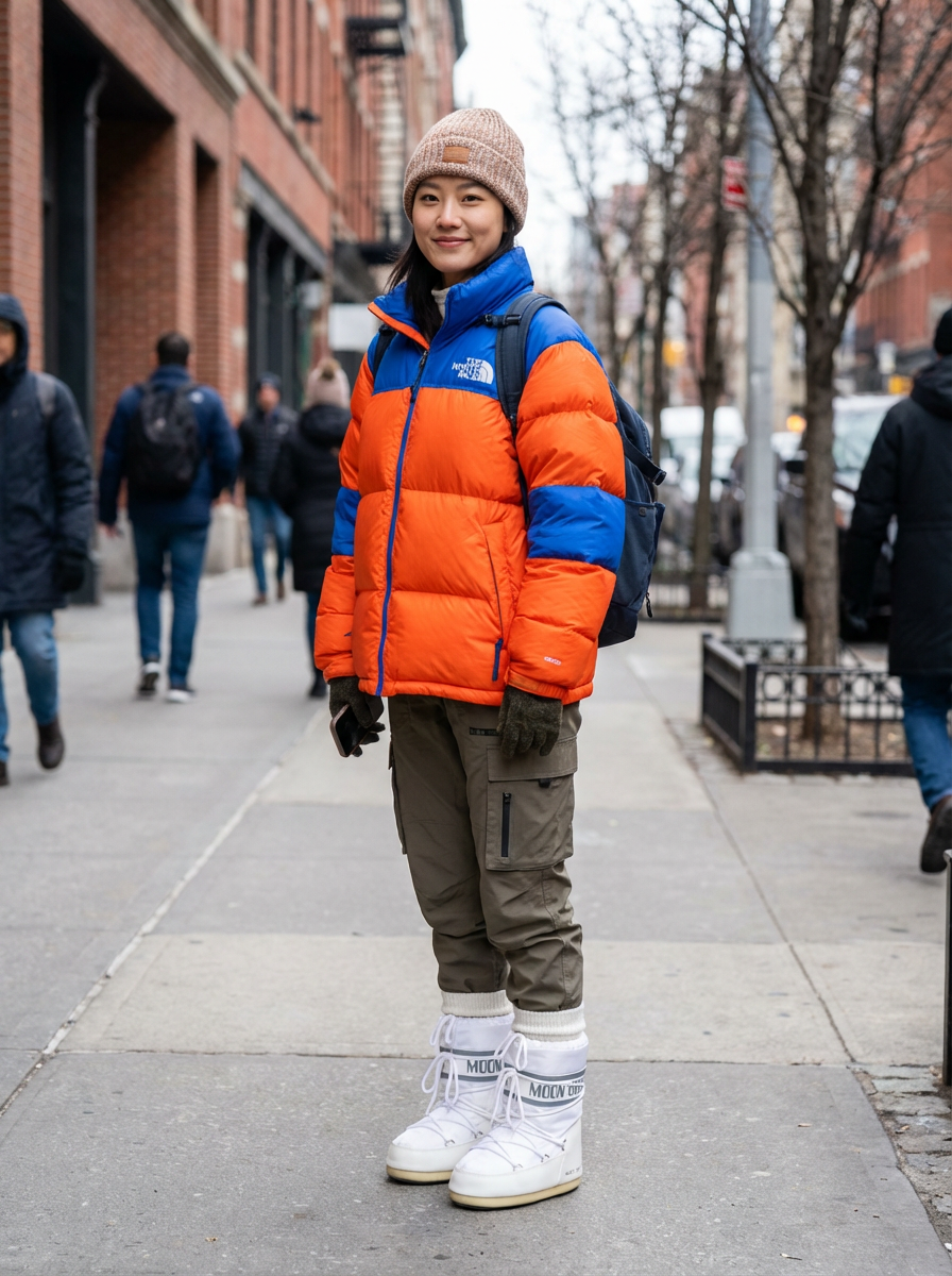 model wearing gorpcore aesthetic, functional outdoor clothing, bright colored puffer jacket, moonboots, beanie, white wool socks, outerwear, posing for photo in the street