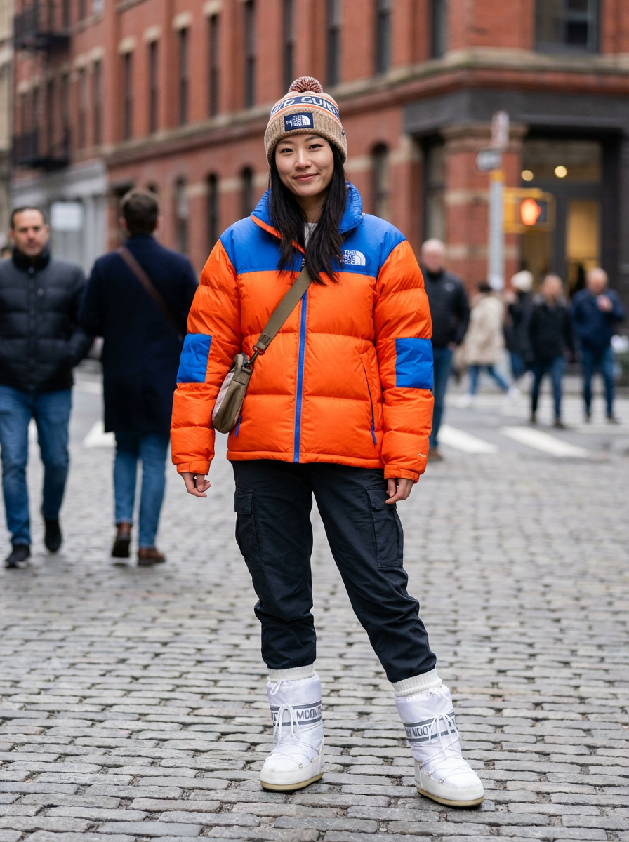 model wearing gorpcore aesthetic, functional outdoor clothing, bright colored puffer jacket, moonboots, beanie, white wool socks, outerwear, posing for photo in the street