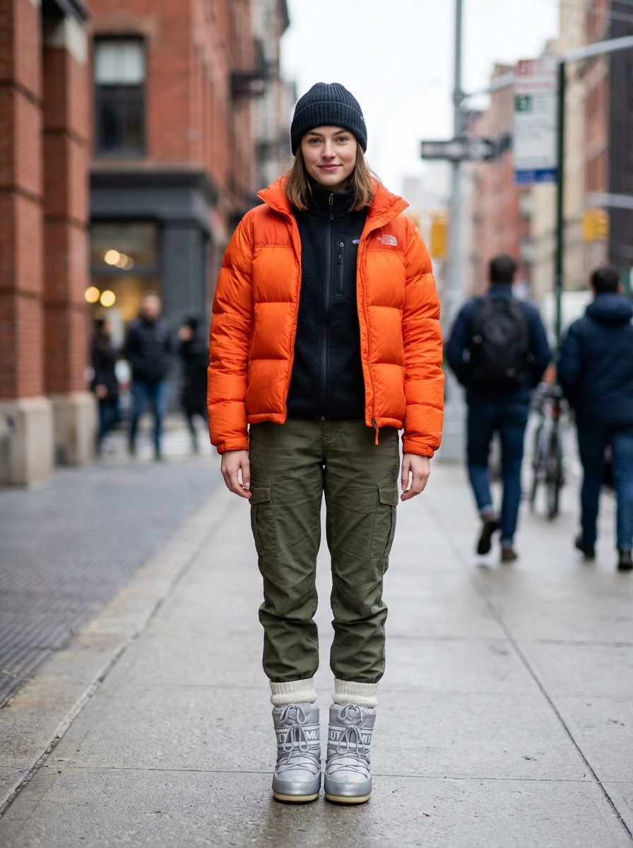 model wearing gorpcore aesthetic, functional outdoor clothing, bright colored puffer jacket, moonboots, beanie, white wool socks, outerwear, posing for photo in the street