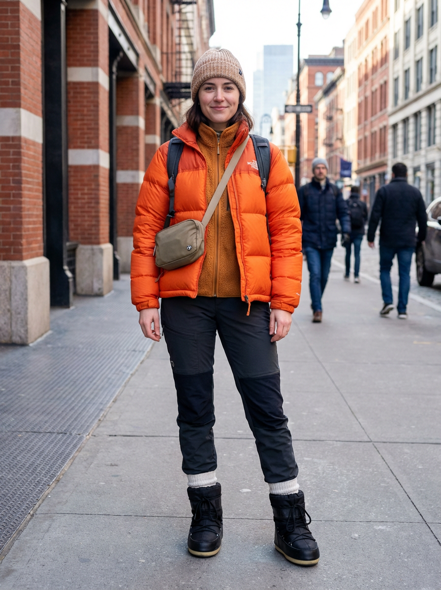 model wearing gorpcore aesthetic, functional outdoor clothing, bright colored puffer jacket, moonboots, beanie, white wool socks, outerwear, posing for photo in the street