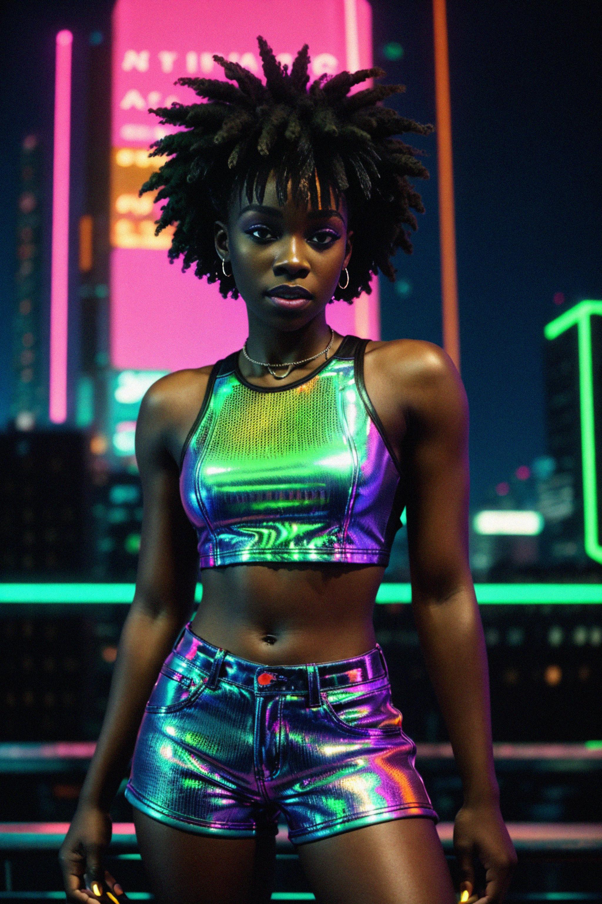 model wearing holographic crop top and digital shorts in a neon-lit Bladerunner-inspired cityscape