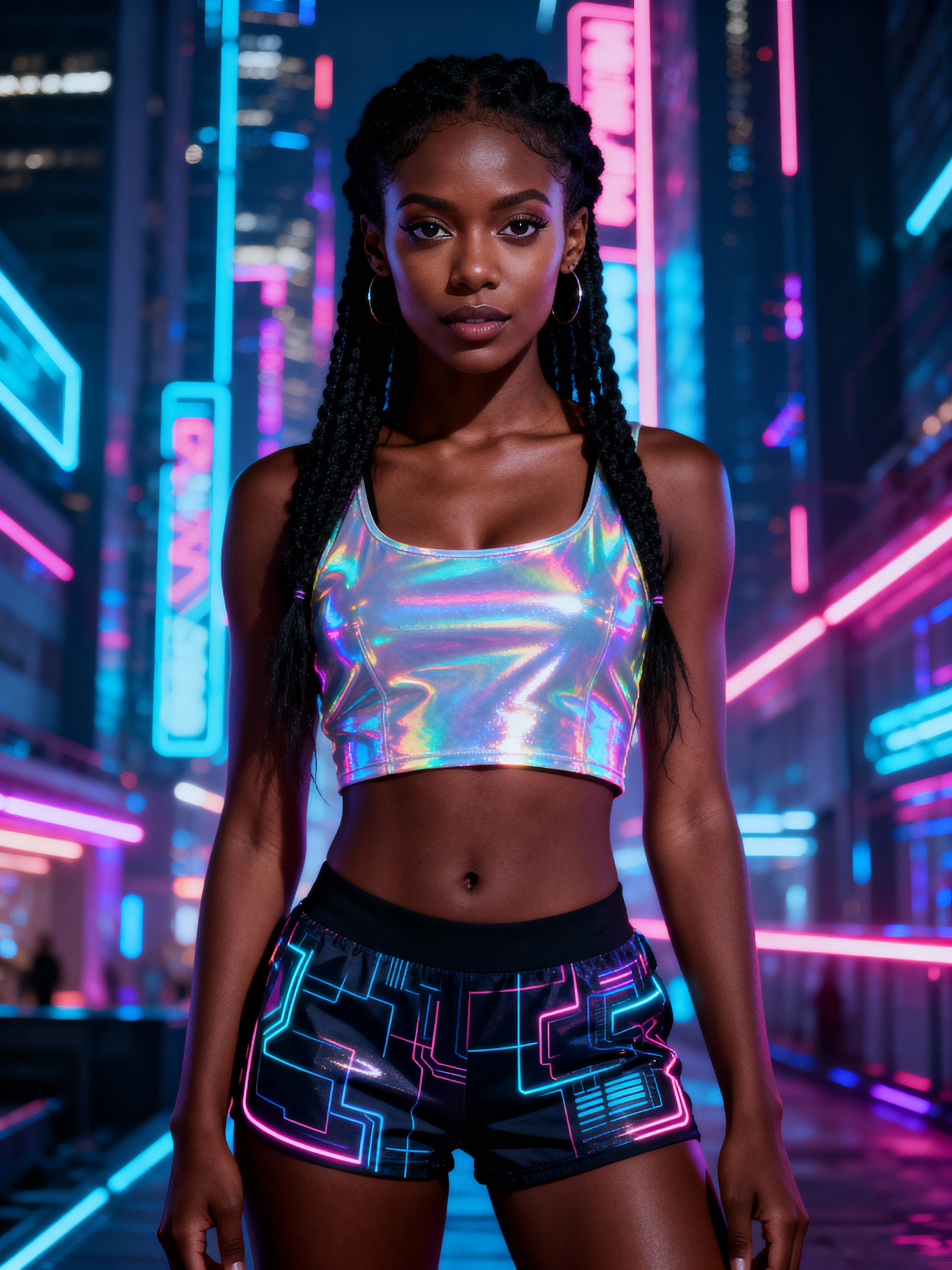 model wearing holographic crop top and digital shorts in a neon-lit Bladerunner-inspired cityscape