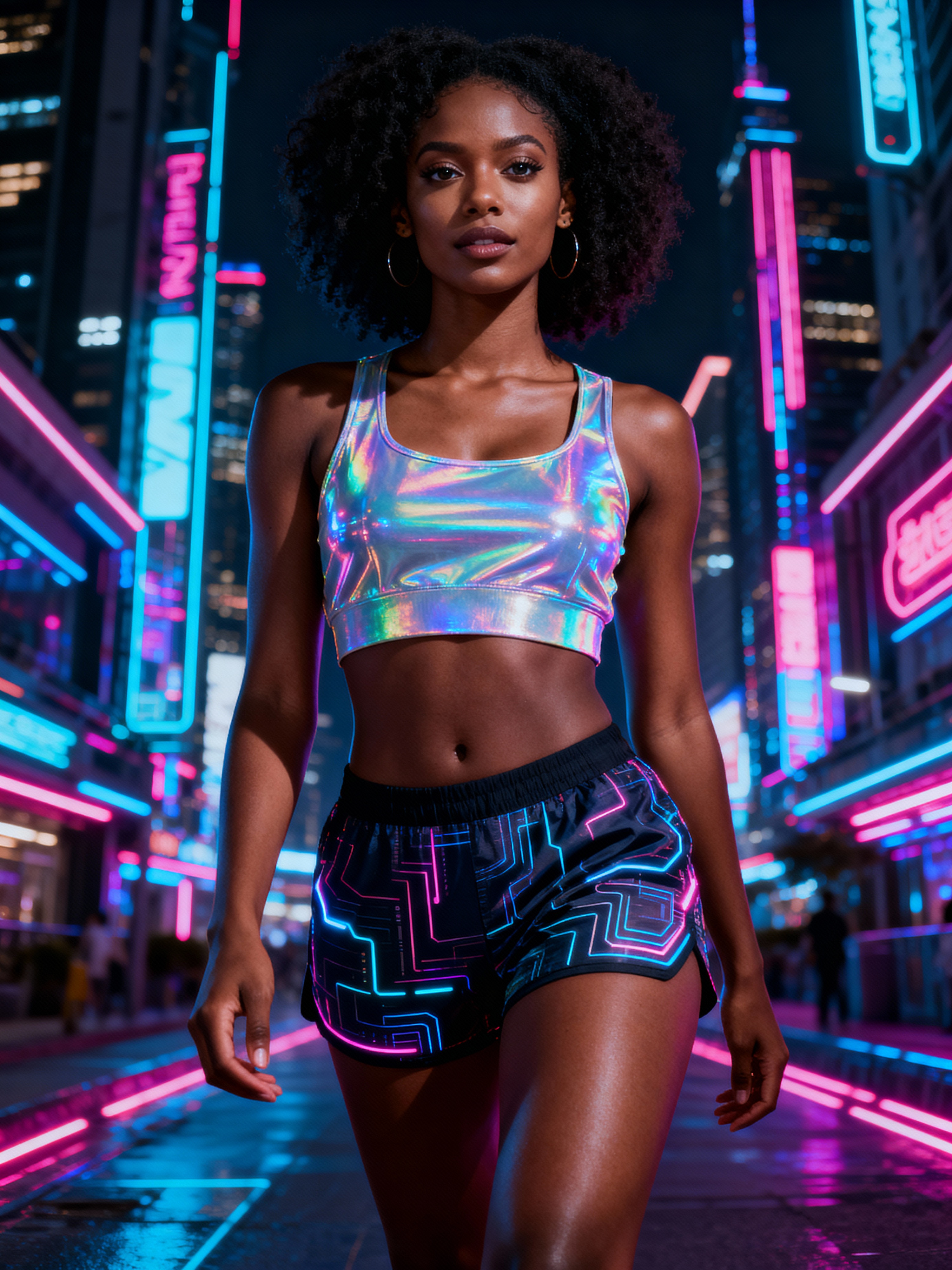 model wearing holographic crop top and digital shorts in a neon-lit Bladerunner-inspired cityscape