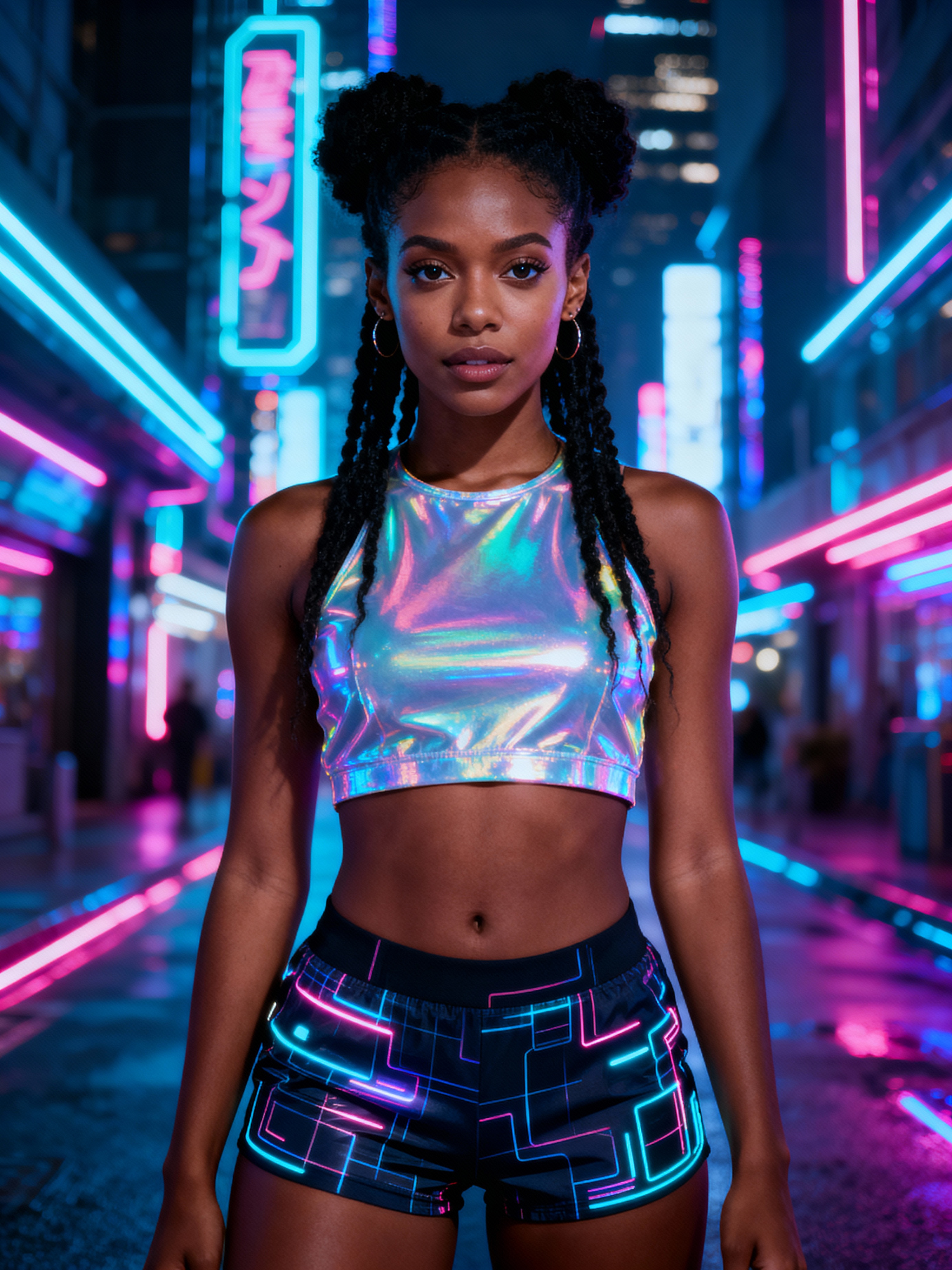 model wearing holographic crop top and digital shorts in a neon-lit Bladerunner-inspired cityscape