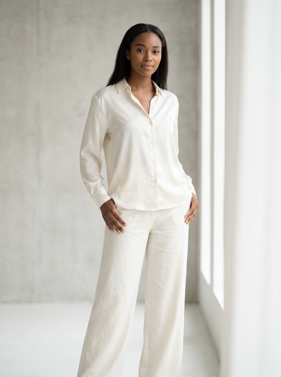 model wearing ivory silk blouse and off-white wide-leg trousers , soft airy textures, ethereal off-white tones, clean minimalist styling, soft diffused natural lighting