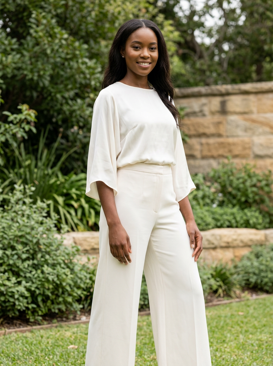 model wearing ivory silk blouse and off-white wide-leg trousers , soft airy textures, ethereal off-white tones, clean minimalist styling, soft diffused natural lighting