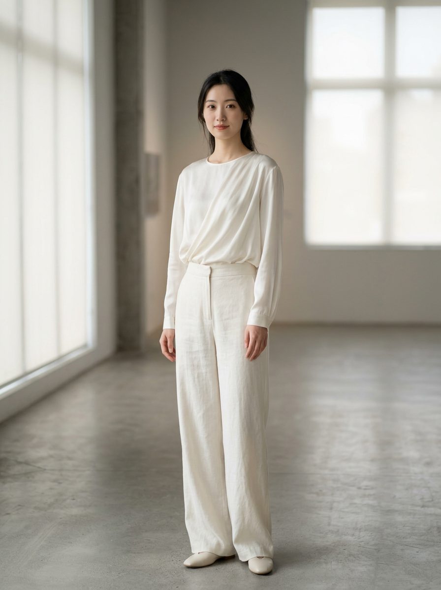 model wearing ivory silk blouse and off-white wide-leg trousers , soft airy textures, ethereal off-white tones, clean minimalist styling, soft diffused natural lighting