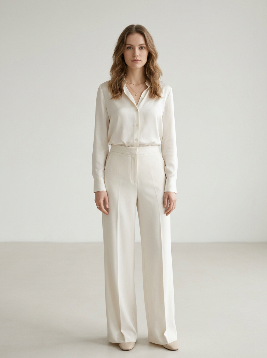 model wearing ivory silk blouse and off-white wide-leg trousers , soft airy textures, ethereal off-white tones, clean minimalist styling, soft diffused natural lighting