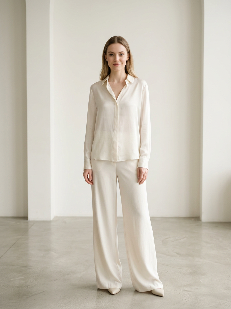model wearing ivory silk blouse and off-white wide-leg trousers , soft airy textures, ethereal off-white tones, clean minimalist styling, soft diffused natural lighting