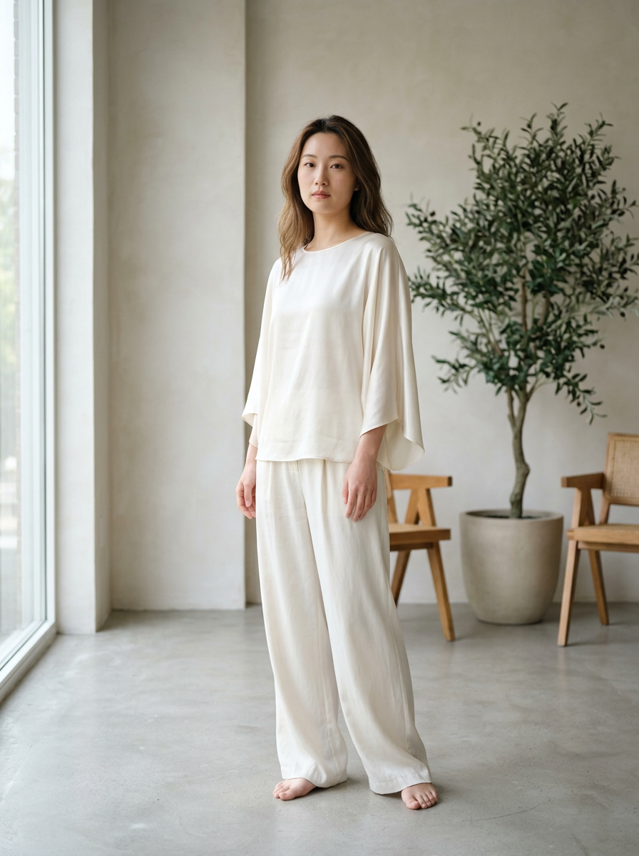 model wearing ivory silk blouse and off-white wide-leg trousers , soft airy textures, ethereal off-white tones, clean minimalist styling, soft diffused natural lighting