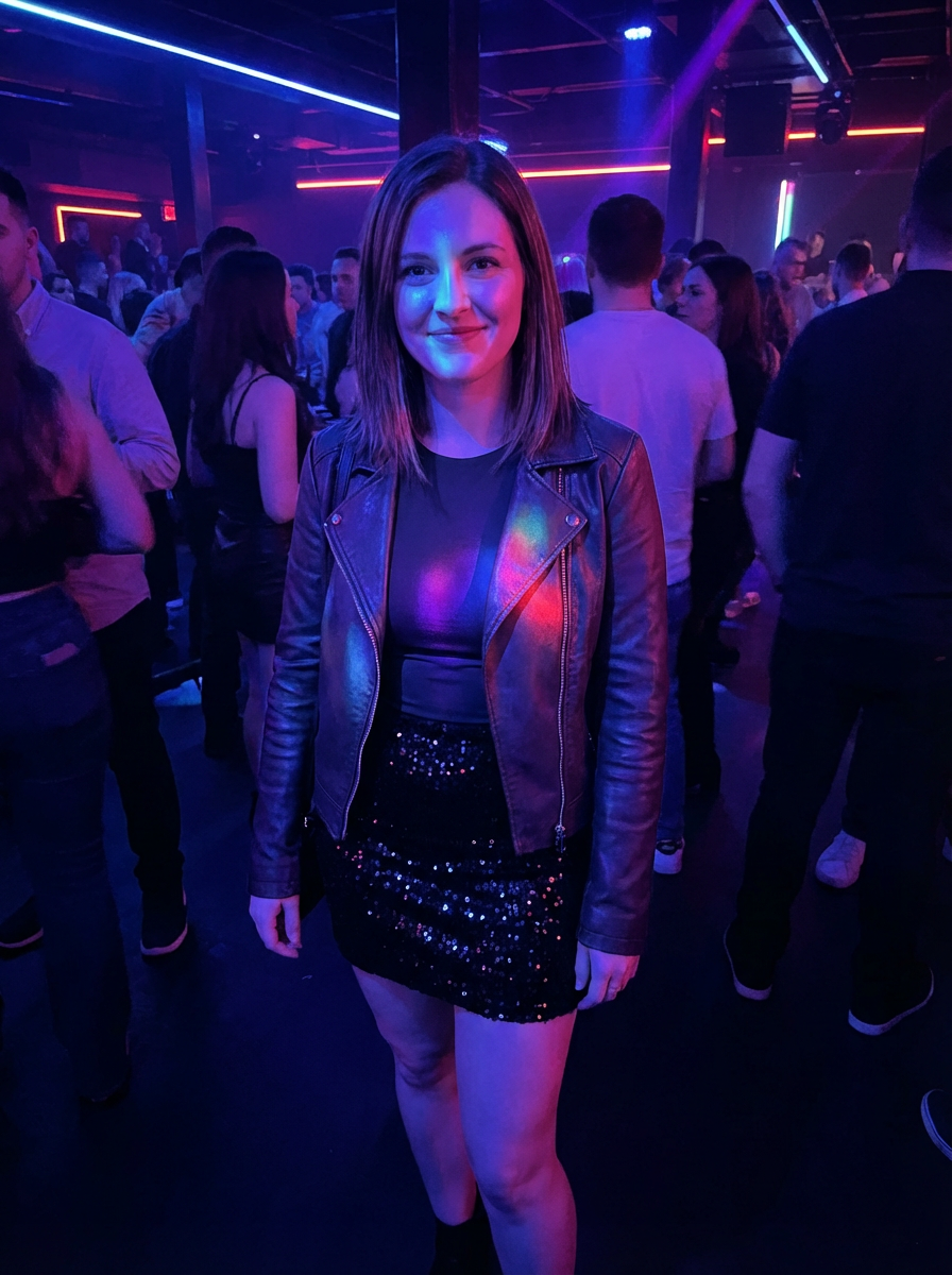 model wearing mini skirt in night club with neon lights