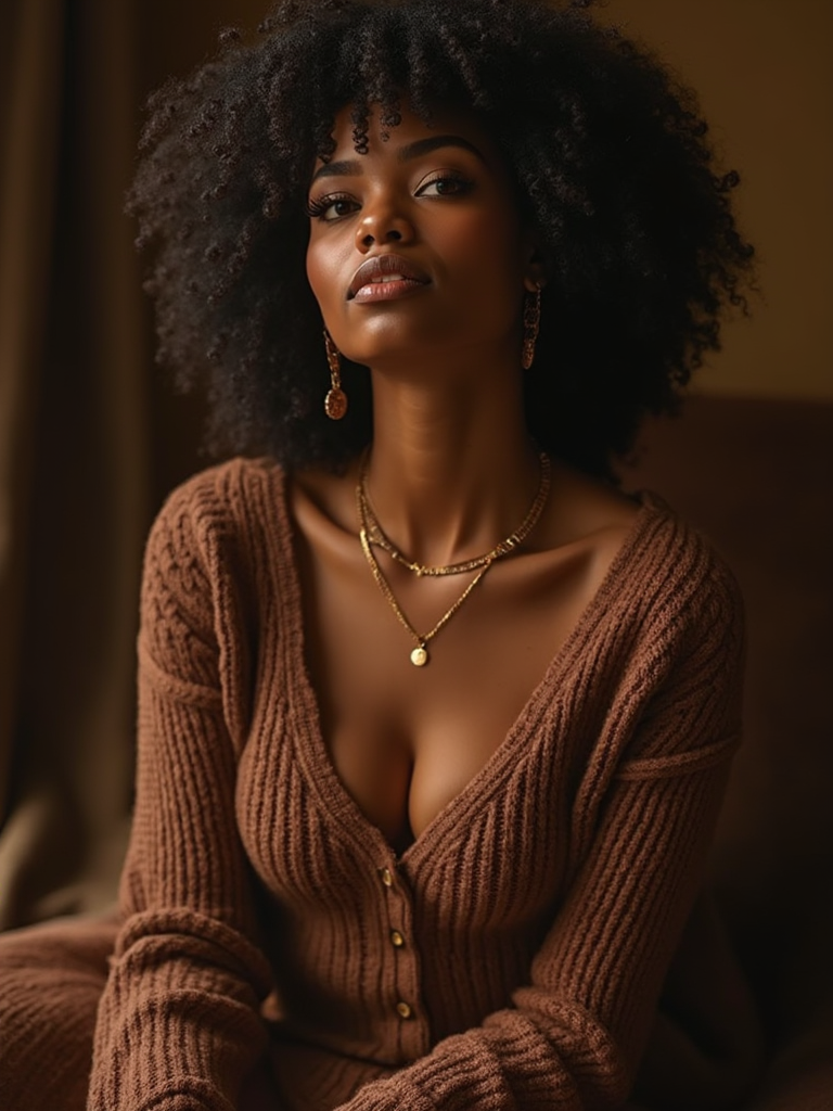 model wearing mocha brown knit set with gold jewelry , cozy luxury aesthetic, rich brown textures, warm studio lighting