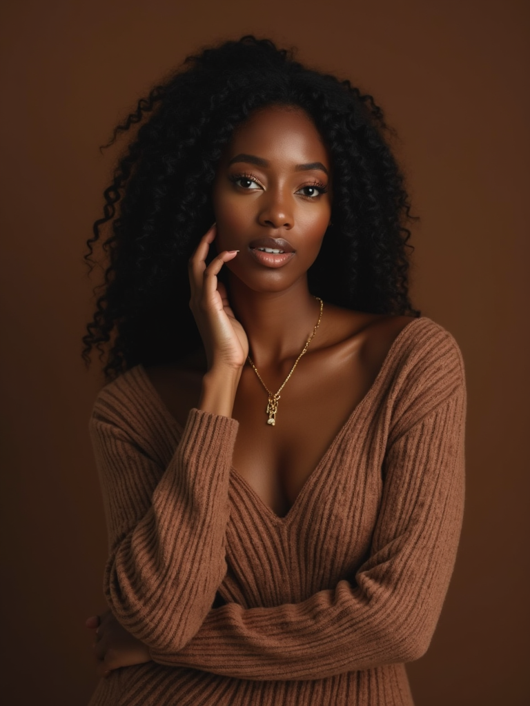 model wearing mocha brown knit set with gold jewelry , cozy luxury aesthetic, rich brown textures, warm studio lighting