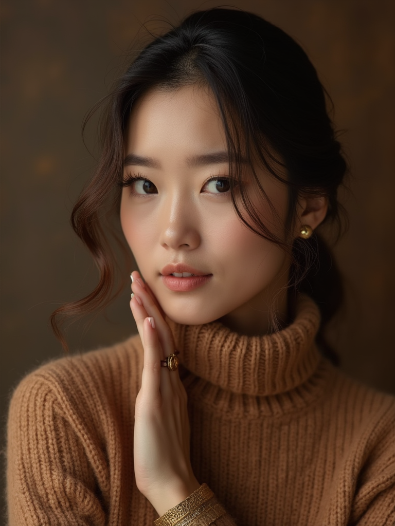 model wearing mocha brown knit set with gold jewelry , cozy luxury aesthetic, rich brown textures, warm studio lighting