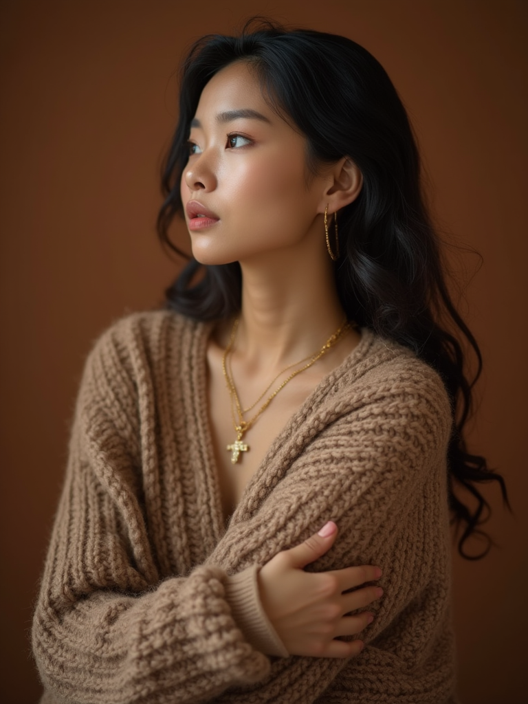 model wearing mocha brown knit set with gold jewelry , cozy luxury aesthetic, rich brown textures, warm studio lighting
