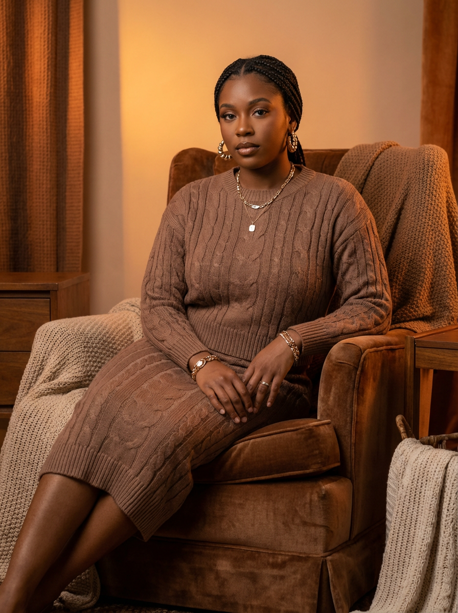 model wearing mocha brown knit set with gold jewelry , cozy luxury aesthetic, rich brown textures, warm studio lighting